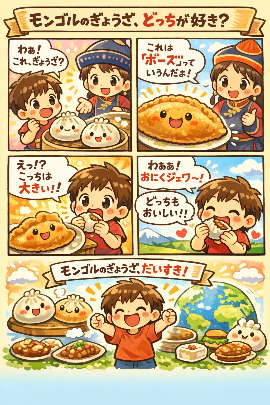 **答え:2. 蒸すか揚げるかの調理法がちがう** ボーズは蒸し餃子、ホーショールは揚げ餃子。どちらも羊肉などを包んだ料理だけど、調理法によって食感や味がまったくちがうんだ。ぜひ両方食べ比べてみてね!🎬 Video of the Day