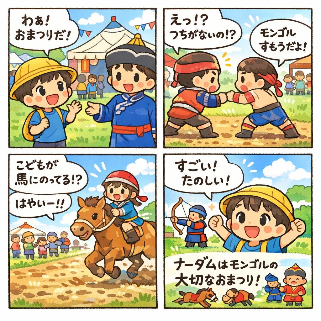 毎年7月、モンゴル全土が盛り上がる国民的なお祭りがあるよ。その名前はナーダム(Наадам)。