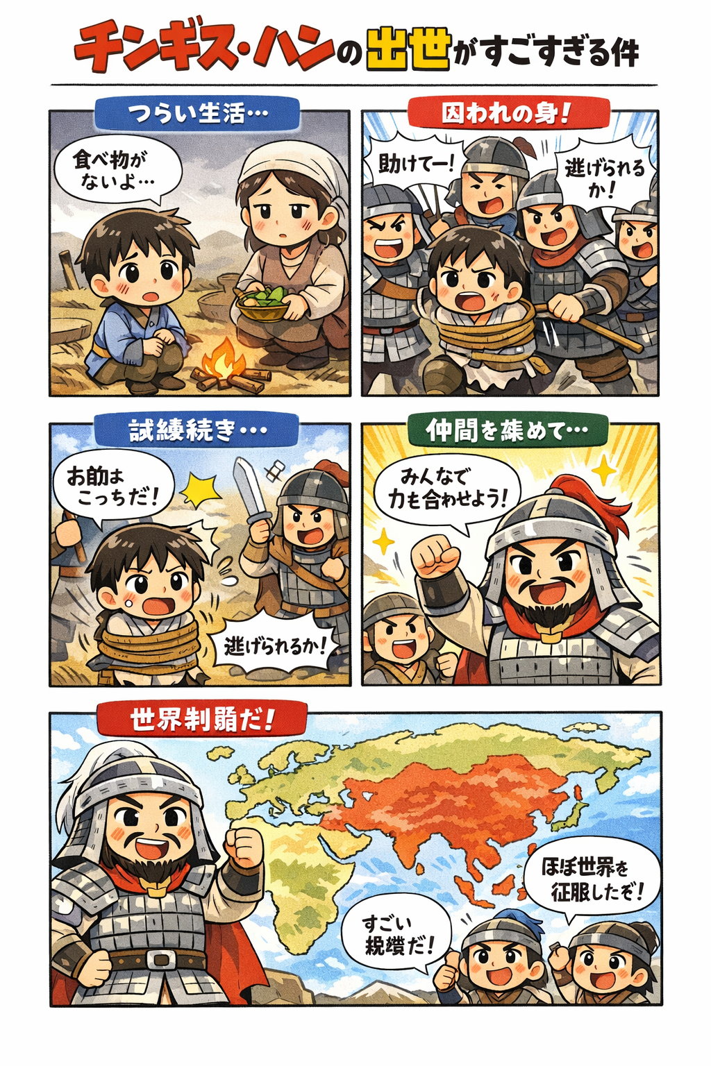 それでもテムジンはあきらめなかった。 脱出し、信頼できる仲間を少しずつ集め、婚約者のボルテが誘拐されたときも必死に取り戻した。 その行動力と義理堅さでどんどん仲間が増えていき、ついにモンゴルの部族をひとつにまとめることに成功したんだ。