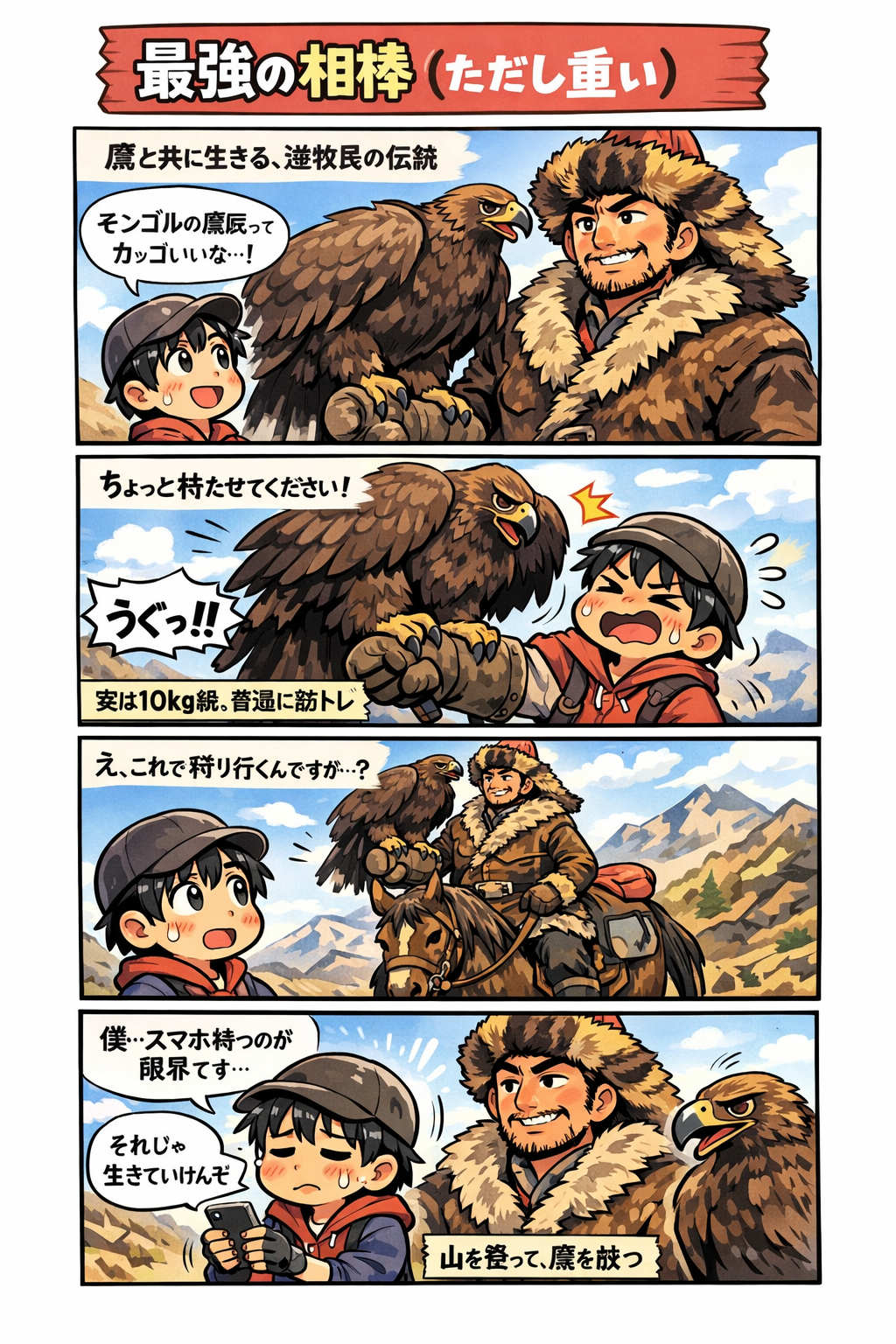 **答え:2. 鷲が7〜10年ほど経ったら** 鷲使いは鷲を一生のパートナーとして飼い続けるわけではないんだ。長年いっしょに過ごして深い絆を育んだあと、ある時期になったら自然に返してあげる。そのあと新しい雛を迎えて、また関係を築き直す。この「出会いと別れの繰り返し」こそが、鷲使い文化の大切な部分なんだよ。🎬 Video of the Day